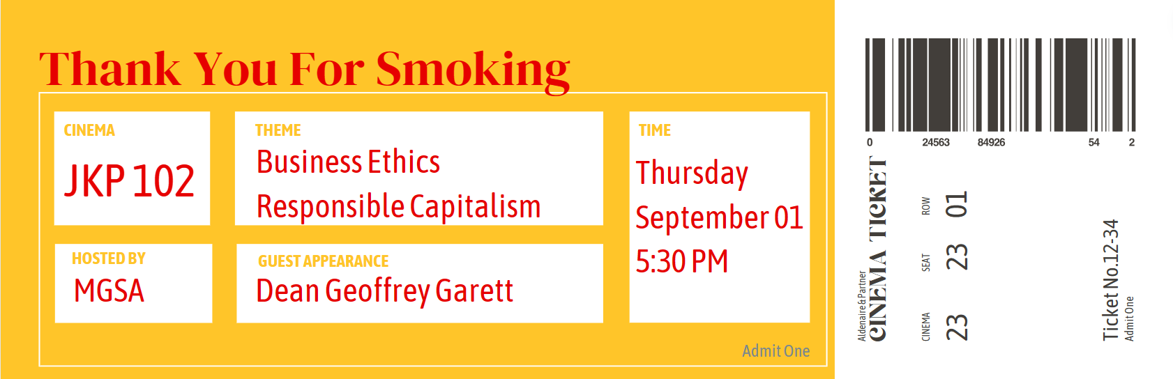 In fact, I worked with our MBA student body to put together a plan for a ‘monthly movie night’ program for a whole semester. I mapped each of these movies to a career club, an elective course, and a professor at the Marshall Scchool of Business. We would meet in our theater style case-rooms at 6pm on the last Thursday of each month with popcorn and sodas to watch one of these movies. The movie would be followed by a discussion among peers about what went right, what went wrong and ethical dilemmas. Alas we were not able to secure rooms on weekdays since our school has a sizeable part-time program that takes evening classes. Here are some of the flyers I’d created for the program: