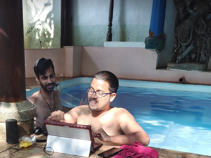 Images: Me working from a pool, from a car, and from a coffee estate with various levels of success.