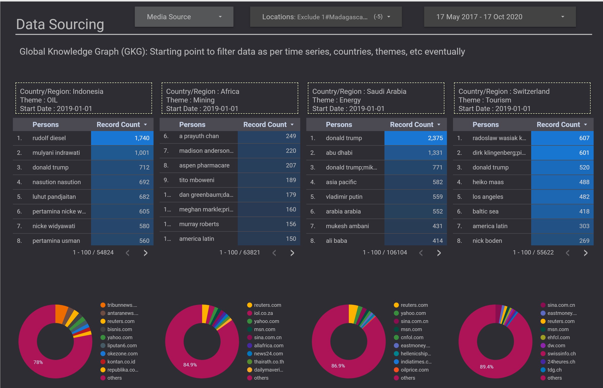 Global Knowledge Graph (GKG): Starting point to filter data as per time series, countries, themes, etc eventually