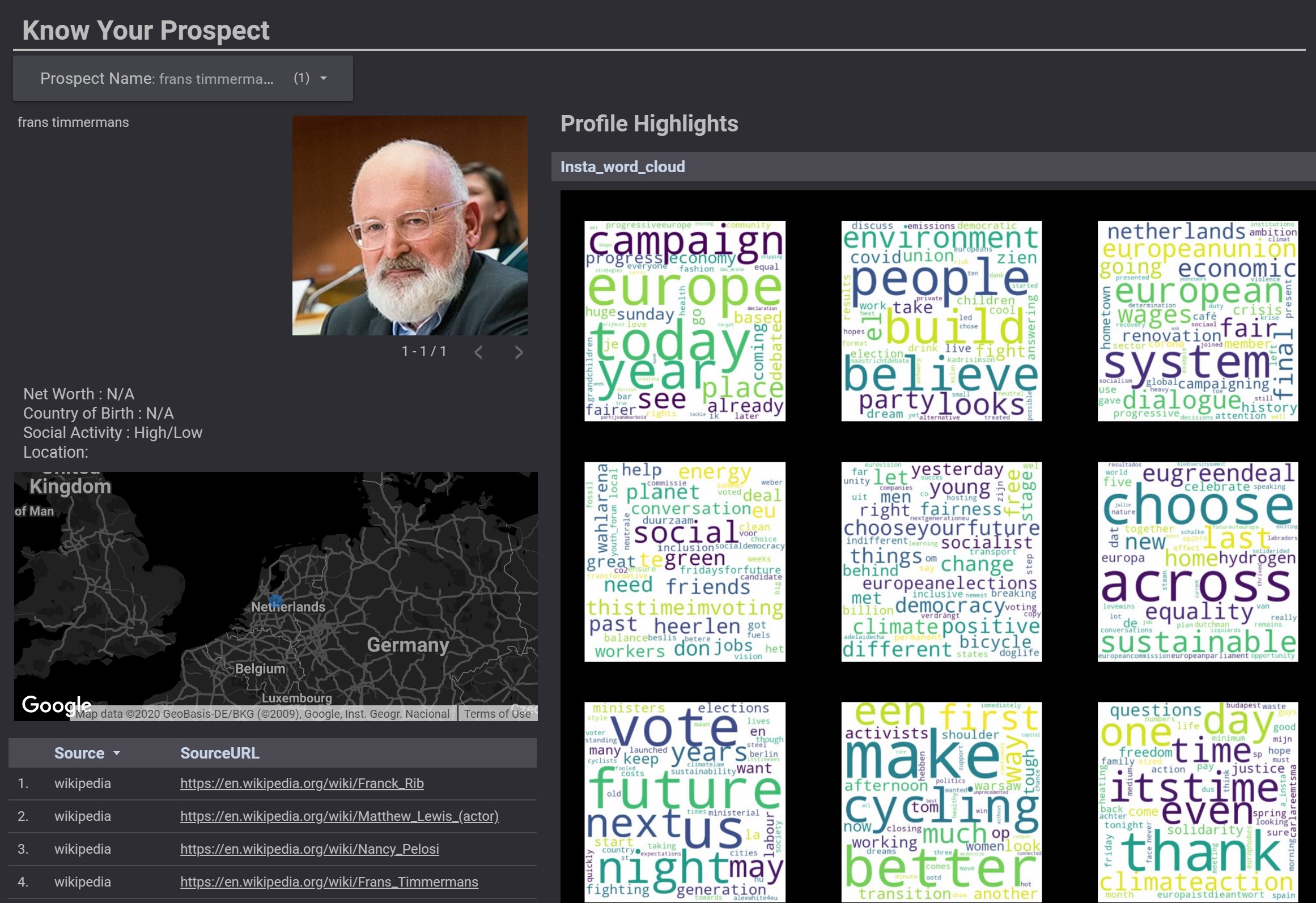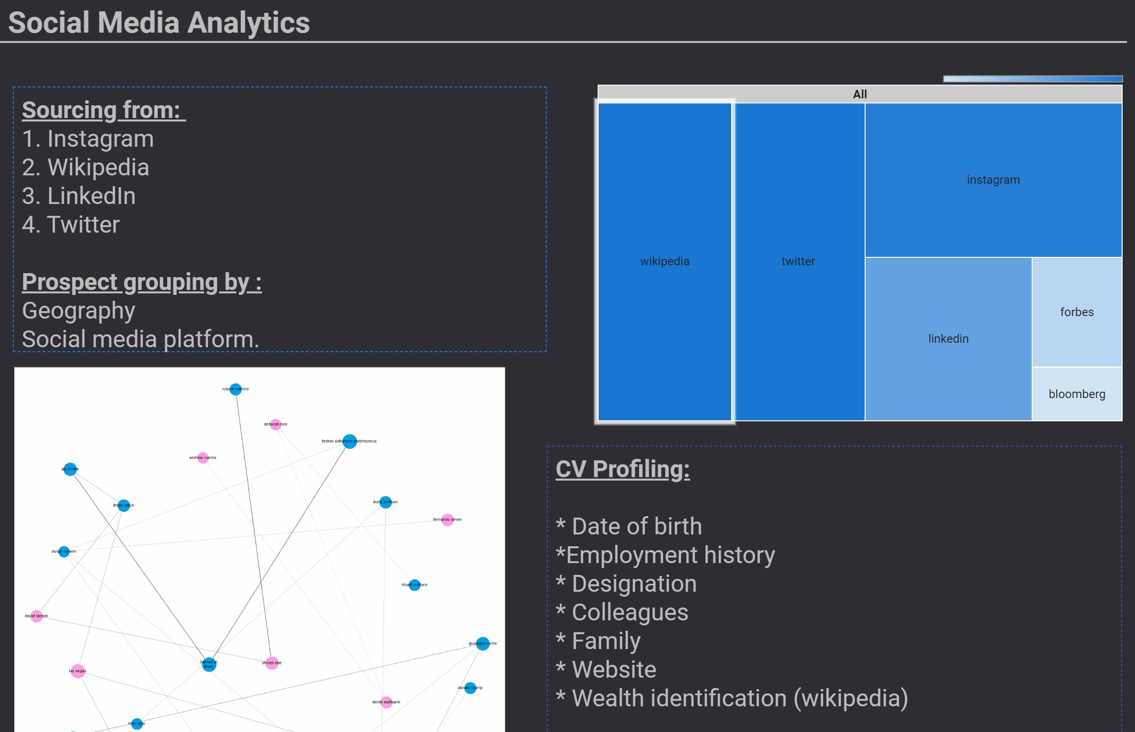 LinkedIn, Wikipedia, Twitter and Instagram were used for profiling and key-value extraction.